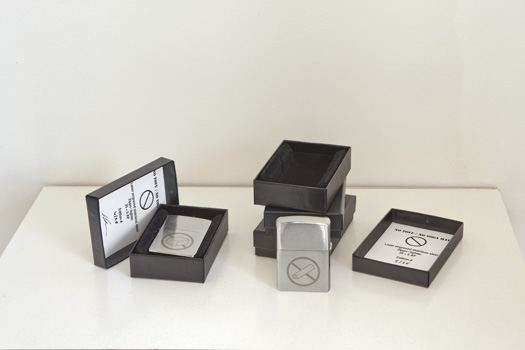 3 September to 10 October 2009 Kelly Mark It's Just One God Damn Thing After Another 12/12 Kelly Mark No Tofu / No Yoga Mat brushed stainless steel Zippo lighter with laser engraving 1.5" x 2.25" x .75" edition of 25 2009