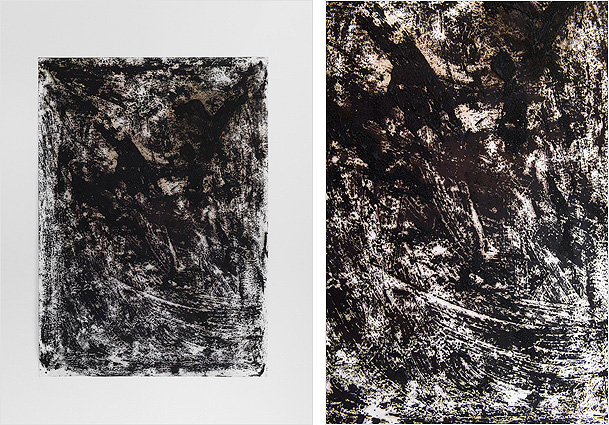 Studies for The Pliable Plane 2 (& detail) Oil paint and asphalt on paper 39 1/4” x 27 1/2” 2014
